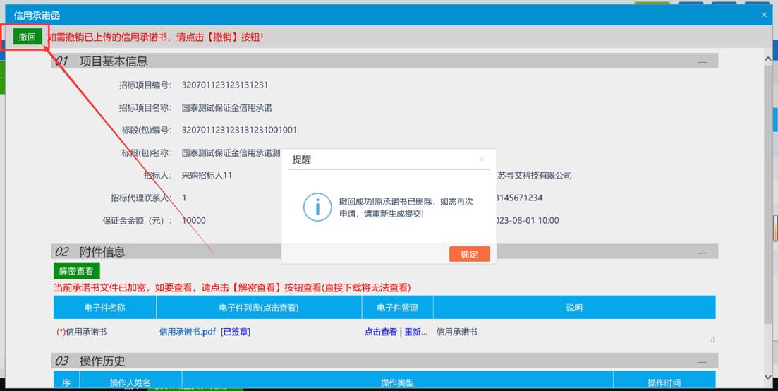投标单位签章提交后如果想取消使用信用承诺,可点击【撤回】按钮进行取消。