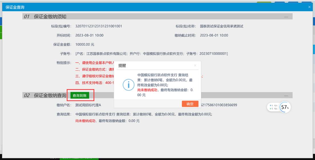 投标单位按时足额一次性的将保证金在截止前汇入招标文件规定的收款账号后,可点击查询按钮进行保证金的到账情况查询。