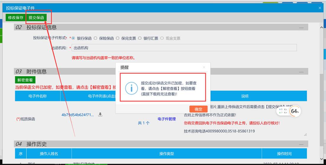 投标保证电子件上传完成之后,请务必点击【提交保函】按钮,提示提交成功。