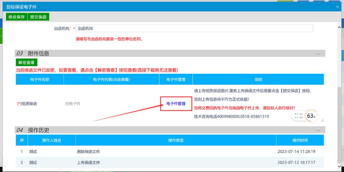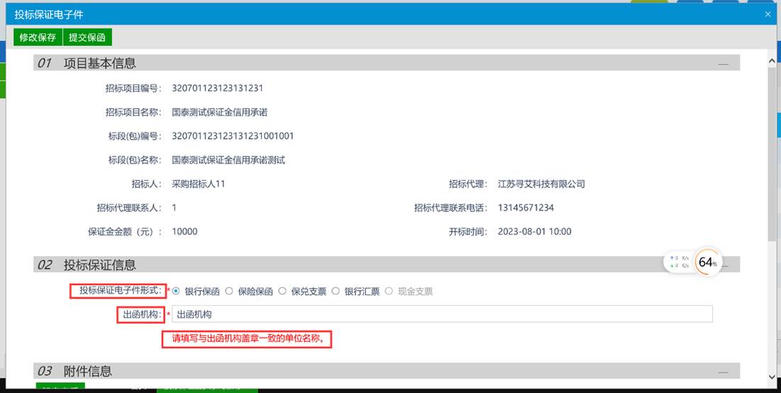 选择投标保证电子件形式与填写出函机构(请填写与出函机构盖章一致的单位名称。)开标前支持修改操作,但请谨慎操作。
