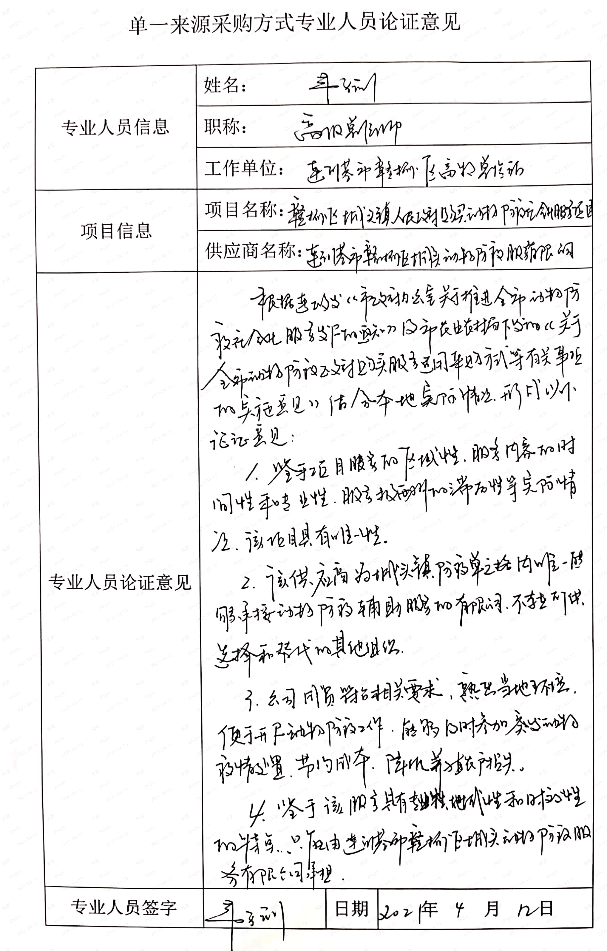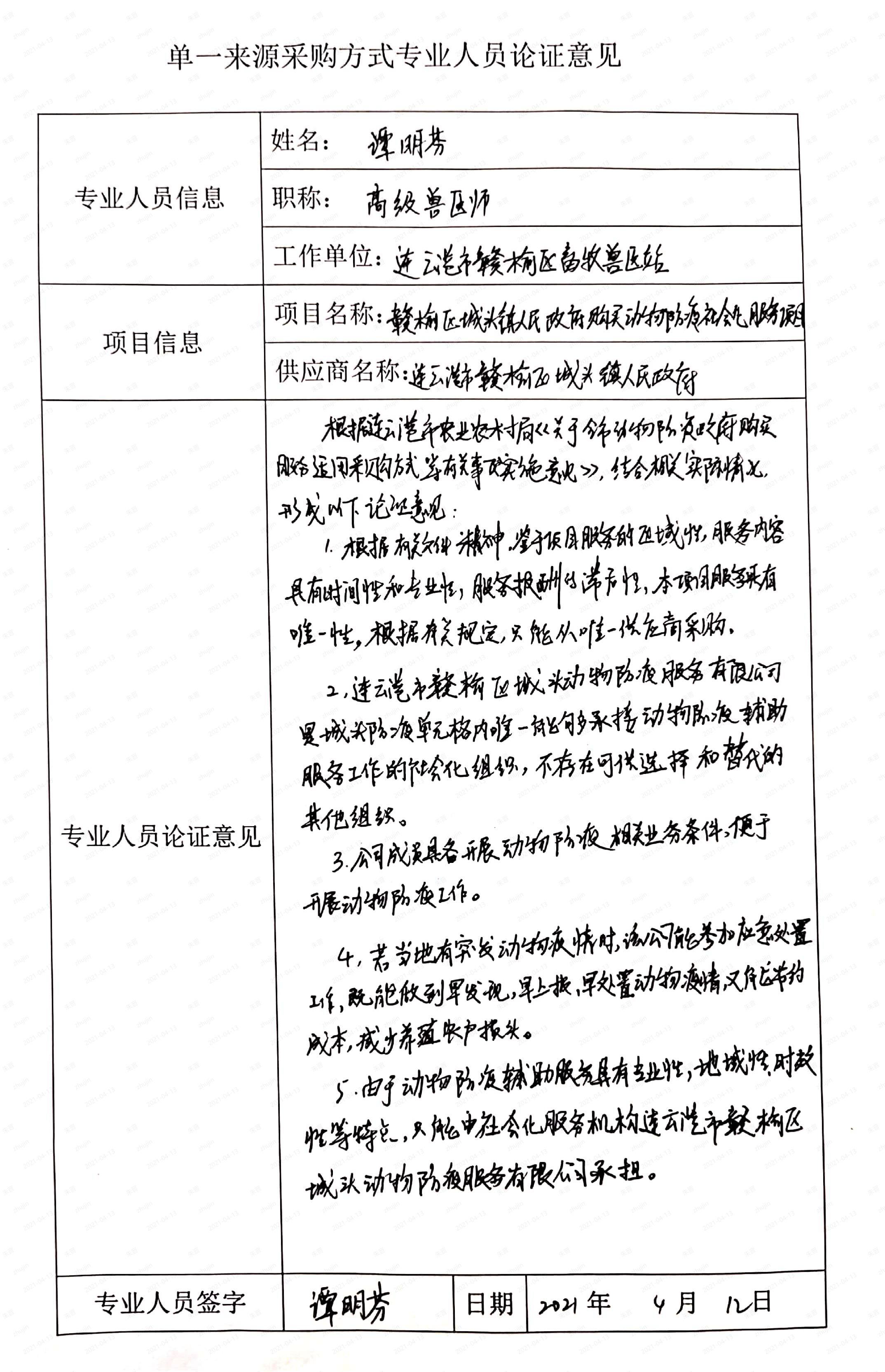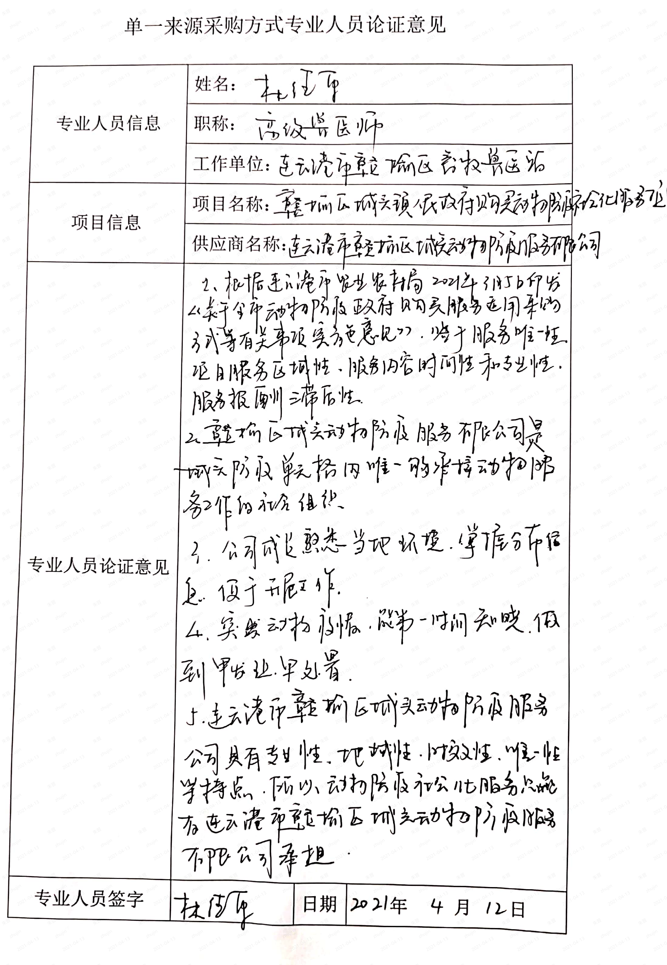 专业人员论证意见:1、根据连政发(2020)14号《市政府办公室关于推进全市动物防疫社会化服务发展的通知》,连云港市农业农村局2021年3月5日《关于全市动物防疫政府购买服务适用采购方式等有关事项实施意见》等文件精神,鉴于本服务项目具有唯一性,项目服务的区域性,服务内容的时间性和专业性,服务报酬的滞后性,根据《政府采购法》第三十一条规定,只能从唯一供应商采购,符合采用单一来源采购方式。2、连云港市赣榆区城头动物防疫服务有限公司是城头防疫单元格内唯一能够承接动物防疫辅助服务工作的社会化组织,不存在可供选择和替代的其他组织。3、公司成员由当地执业兽医、乡村兽医为主体,熟悉当地环境,与养殖农户联系密切,掌握分布信息,便于开展动物防疫工作。4、突发动物疫情时,该公司能参加应急处置工作,既能做到早发现,早上报、早处置动物疫情,又能节约成本,减少养殖农户损失。5、由于动物防疫辅助服务具有专业性、地域性和时效性等特点,只能由社会化服务机构连云港市赣榆区城头动物防疫服务有限公司承担。