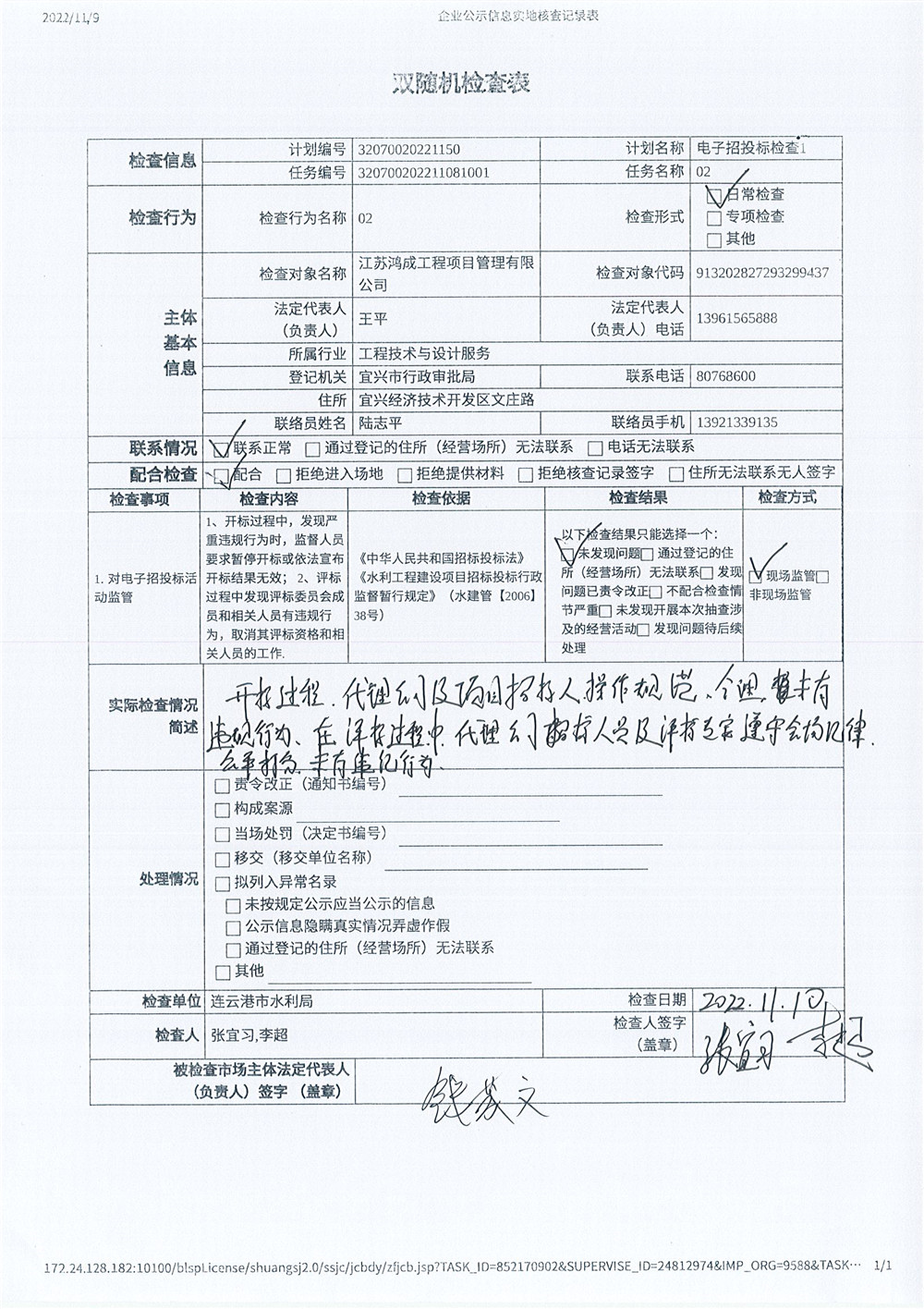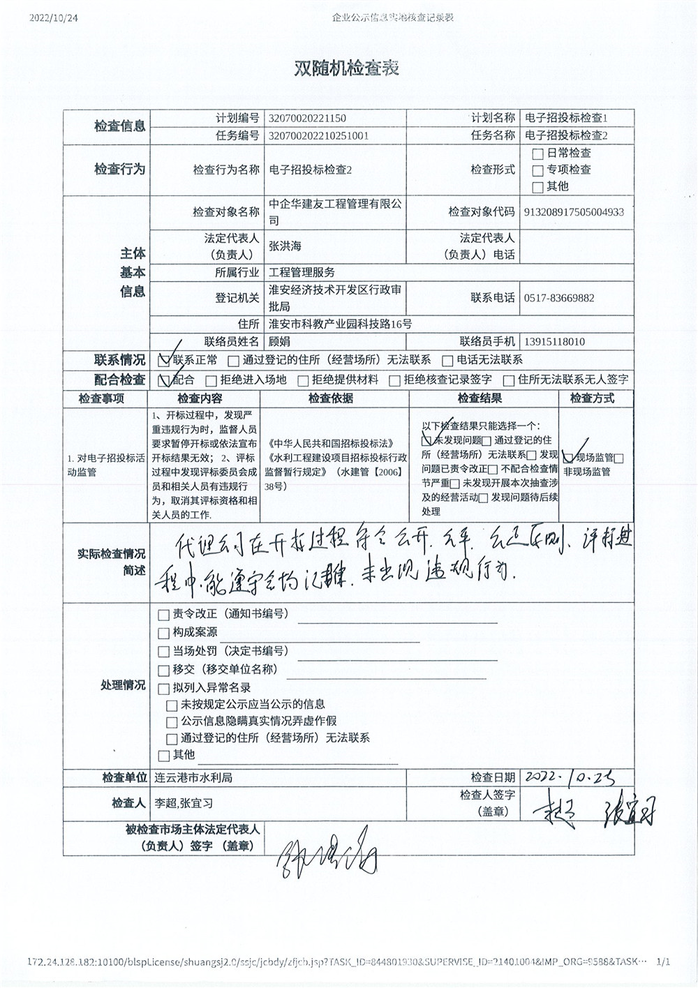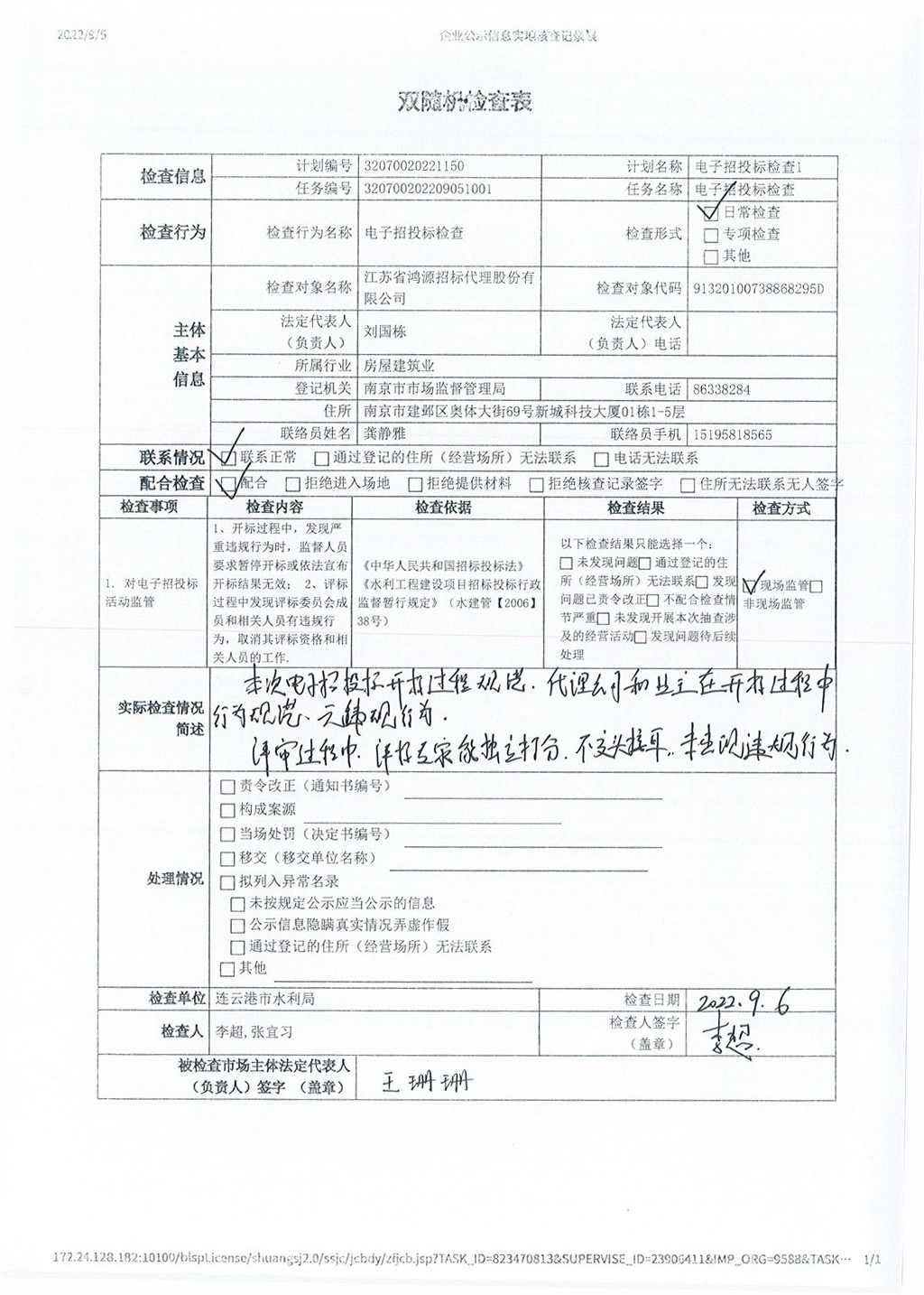 | 根据《市水利局关于开展2022年水利工程招标投标“双随机、一公开”检查工作的通知》要求,市水利局对江苏省鸿源招标代理股份有限公司、江苏鸿成工程项目管理有限公司、连云港市正源招标代理有限公司、江苏交通工程投资咨询有限公司、中企华建友工程管理有限公司共5个招标代理机构进行电子招投标检查。现将随机监督抽查结果公示如下: | |||